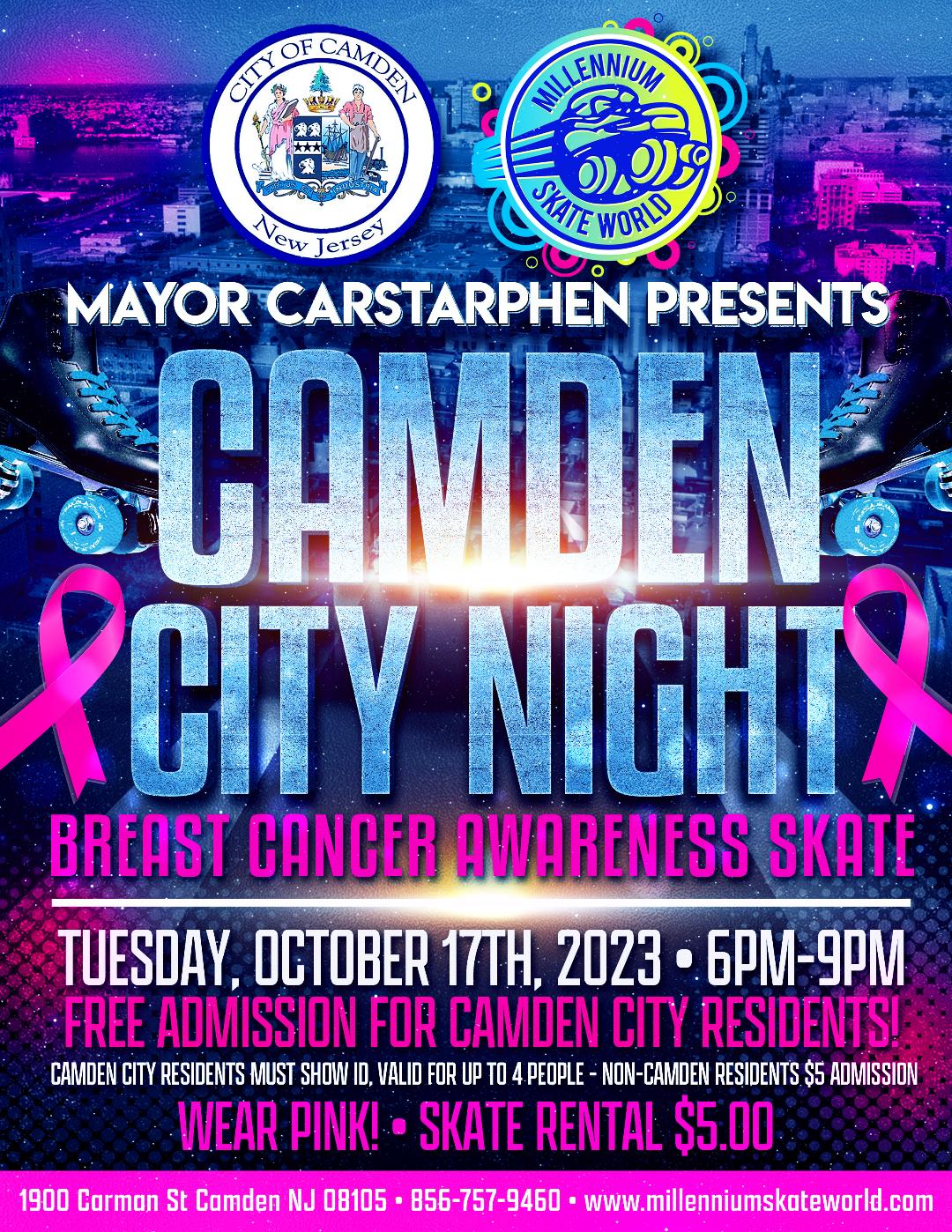 Camden City Night Family Skate with Mayor Carstarphen FREE Admission for Camden residents Show Camden ID...receive (4) Free admission Skate rental $5.00 Wear Pink in honor of Breast Cancer Awareness *optional Parents stay with your kids, No drop-offs |