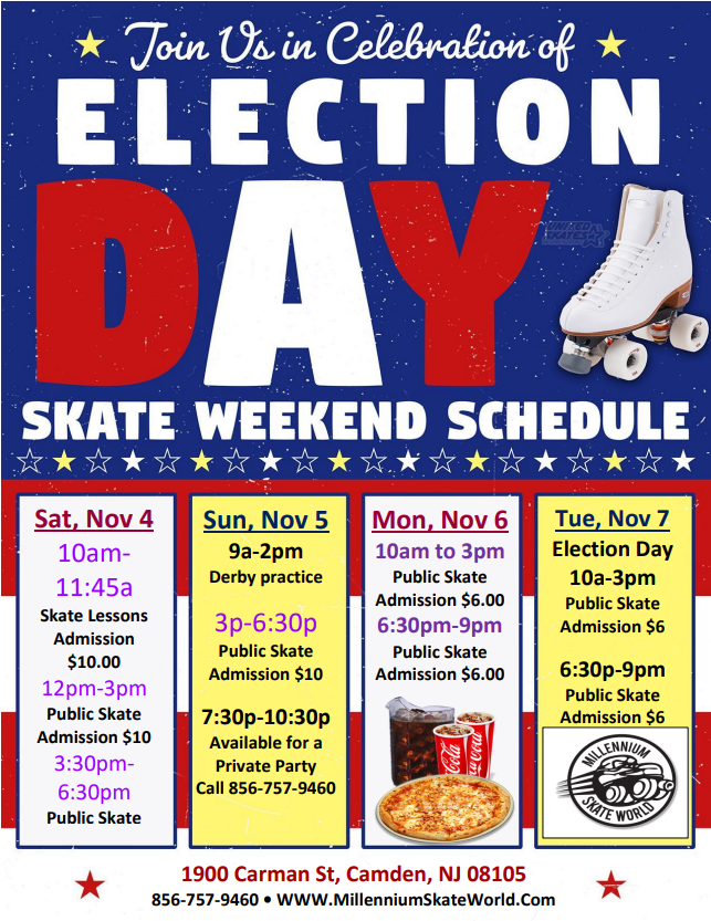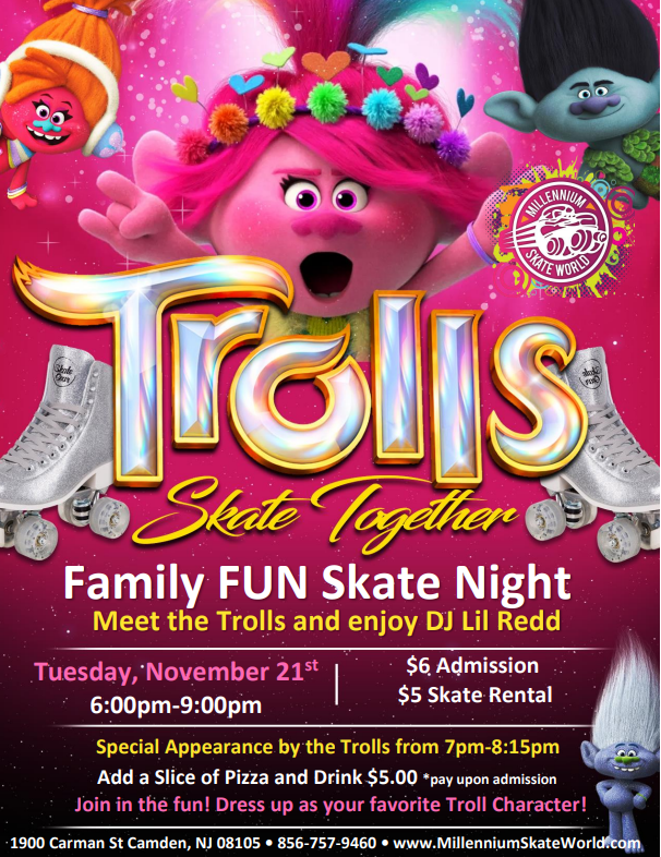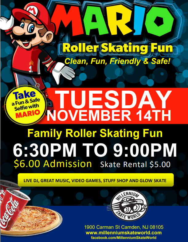 Family Fun Roller Skating 3pm-6:30pm Admission $10.00 Skate rental $5.00 Perfect day or a Birthday party Book a Group of 20 people or more ~~~~~~~~~~~~~~~~ Family package for 4 people $69.99 (4) Admission, (4) Skate rental, (4) Slices of pizza and (4) 8oz drinks