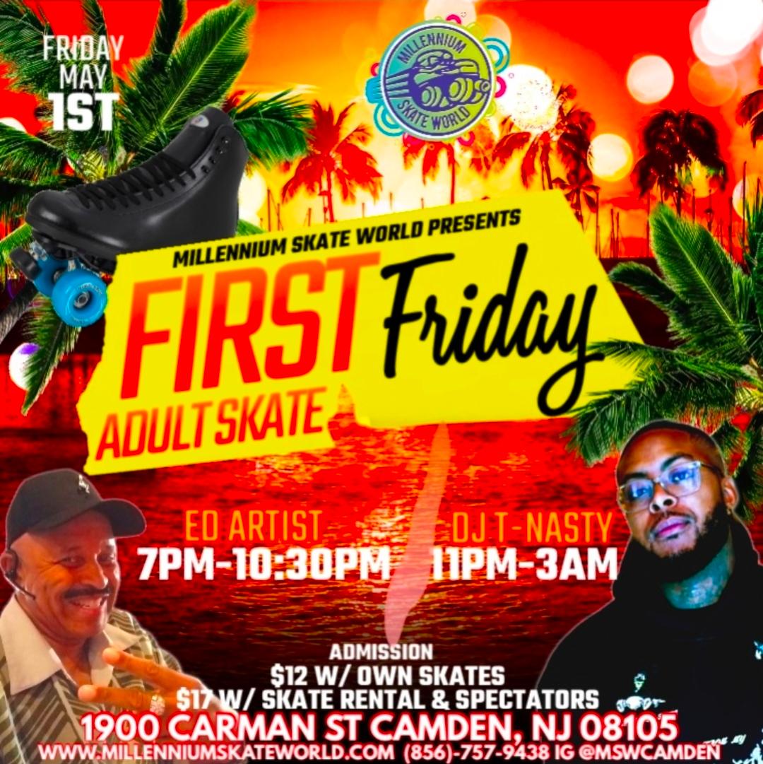 1st Friday Adult Late Skate 11pm-3am Get your ROLL on to your favorite Hip Hop. R&B and House music Schedule a Birthday Party Meetup with friends and family Featuring DJ T-Nasty $12 Admission with own skates $17 Admission with rental skates/Spectators