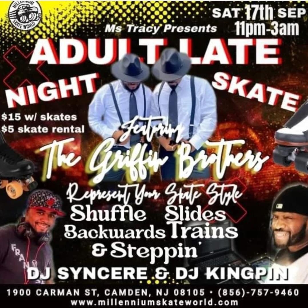 Ms Tracy presents Adult Night Late Skate featuring The Griffin Brothers ALL Skate Styles Shuffle Trains Fast Backwards $15.00 Admission with Own Skates $20.00 Admission with Rental Skates/Spectators