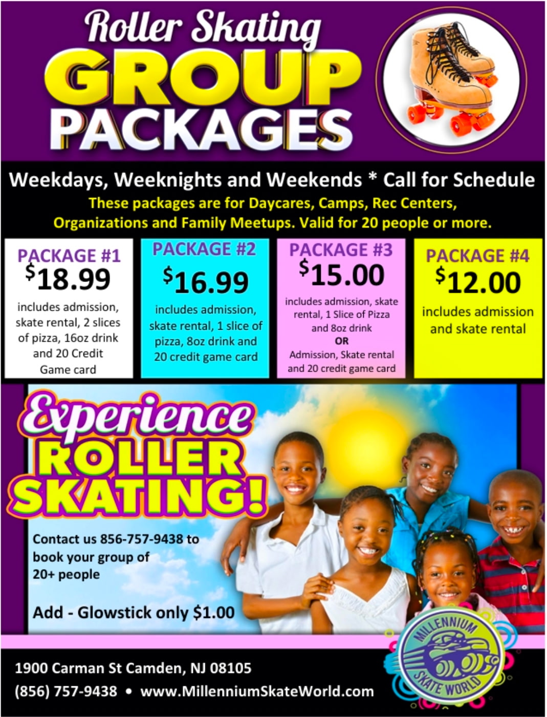 Get amazing group rates for camps, day cares, youth clubs, church groups, after school programs, parks and recreation programs, and more! Schedule a day out and get great discounted group rates and an all-inclusive experience. Group packages are available during any of our Family Public Skate Sessions.