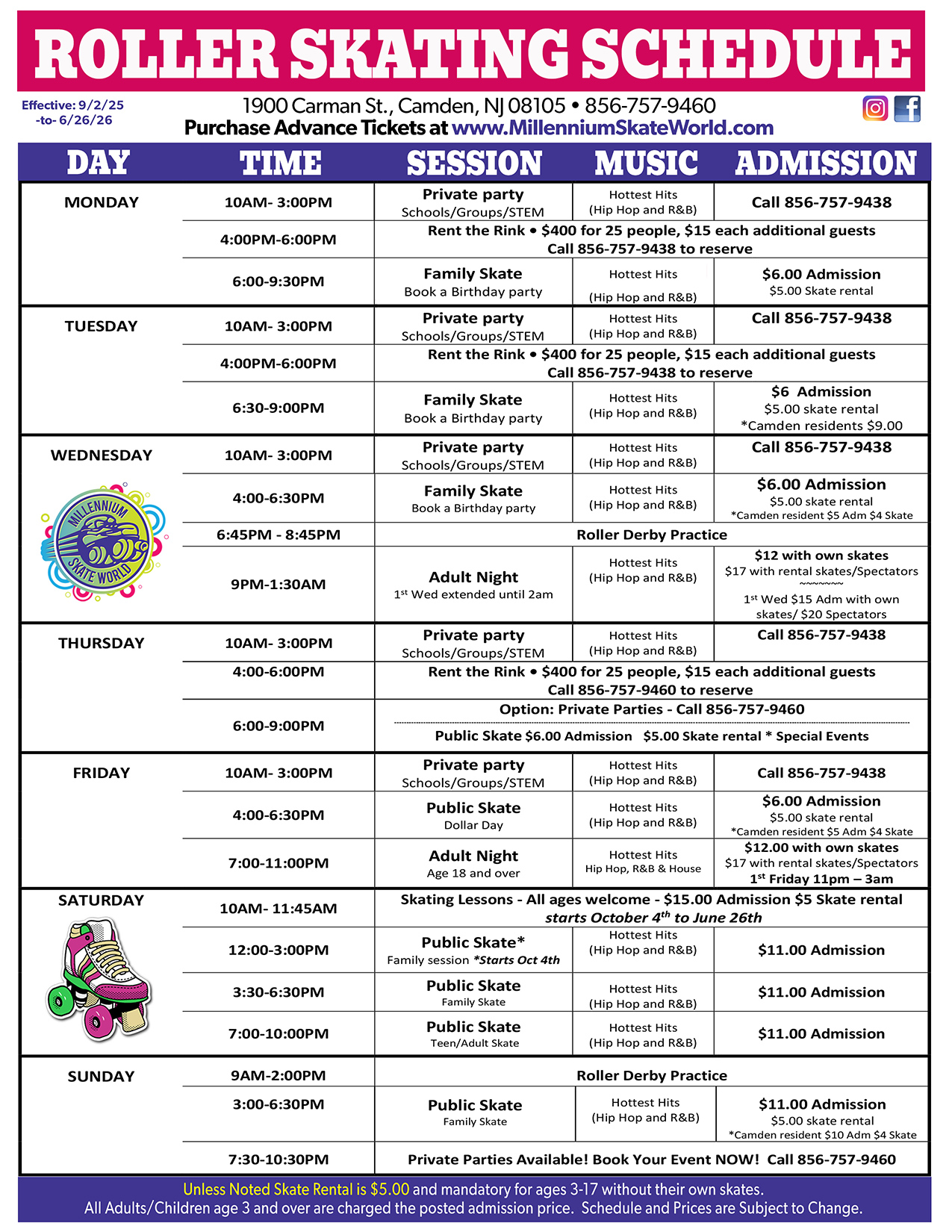 Camden City Residents Family Night Skate 6pm-9pm FREE Admission for Camden City Residents *Show Camden City resident ID for up to 4 people $5.00 Skate rental Schedule a Birthday party Meetup with Family and Friends Non-Residents $10 per person |