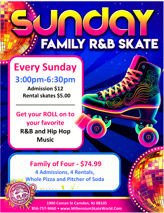 Millennium Skate World 1900 Carman St., Camden, NJ, United StatesRent Millennium Skate World for 2 hours Family FUN Gathering Meetup with friends Business Meeting and Skate Celebrate a Special Occasion All ages welcome 4pm-6pm Only $400 for up to 25 people - includes Admission and Skate rental ~~~~~~~~~~~~~ Option: Add a slice of Pizza and Drink - $5 per person Add a Whole Pizza […]
