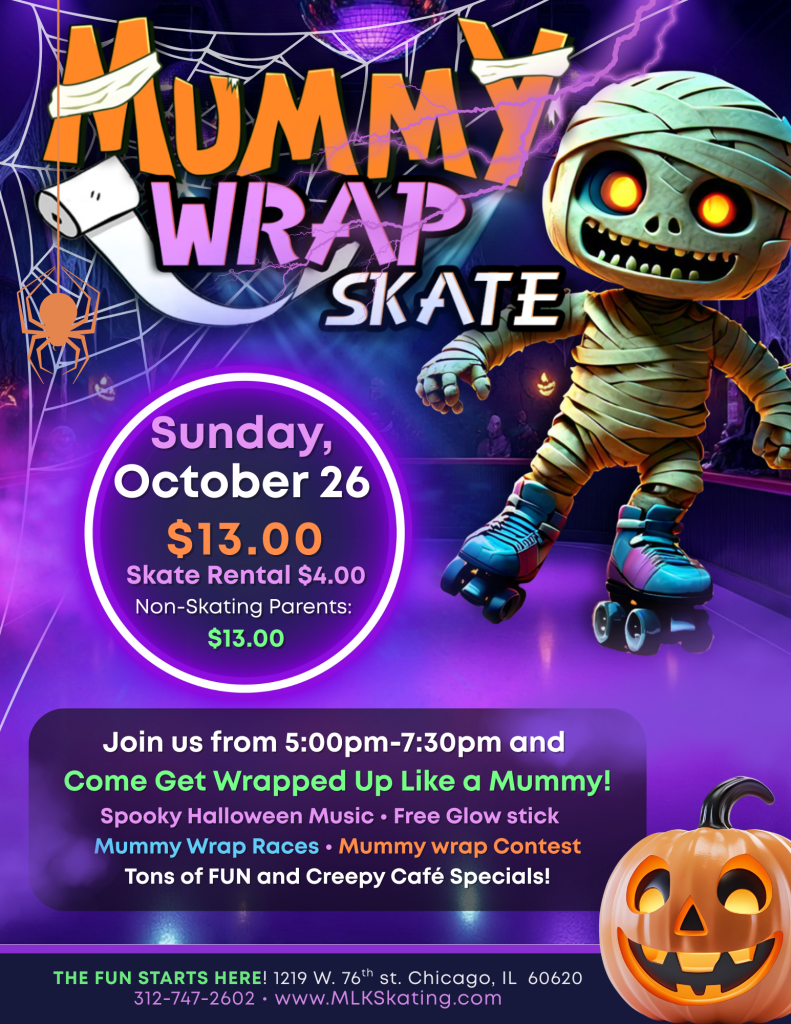 Join us for our Mummy Wrap Skate on Sunday, October 26th from 5 PM โ 7:30 PM!