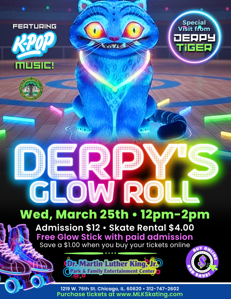 Join us during Spring Break and get ready to roll, glow, and vibe to your favorite K-Pop hits during this fun daytime glow skate event Featuring Derpy the Tiger!