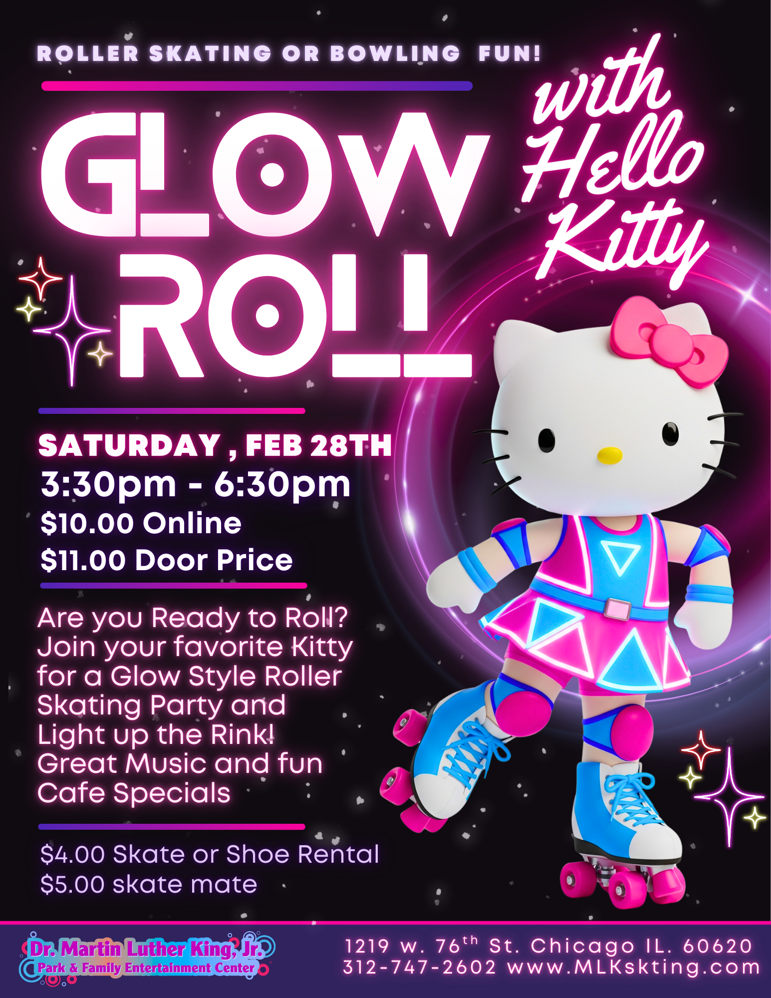 Bring the family, wear your glow, and skate, bowl, and shine with Hello Kitty! ๐โจ