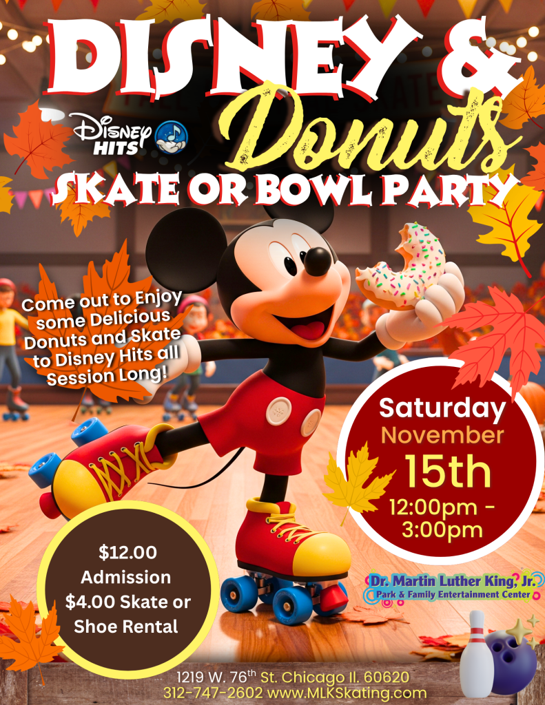 Come out and enjoy delicious donuts while you skate or bowl to your favorite Disney hits all session long! πΆβ¨