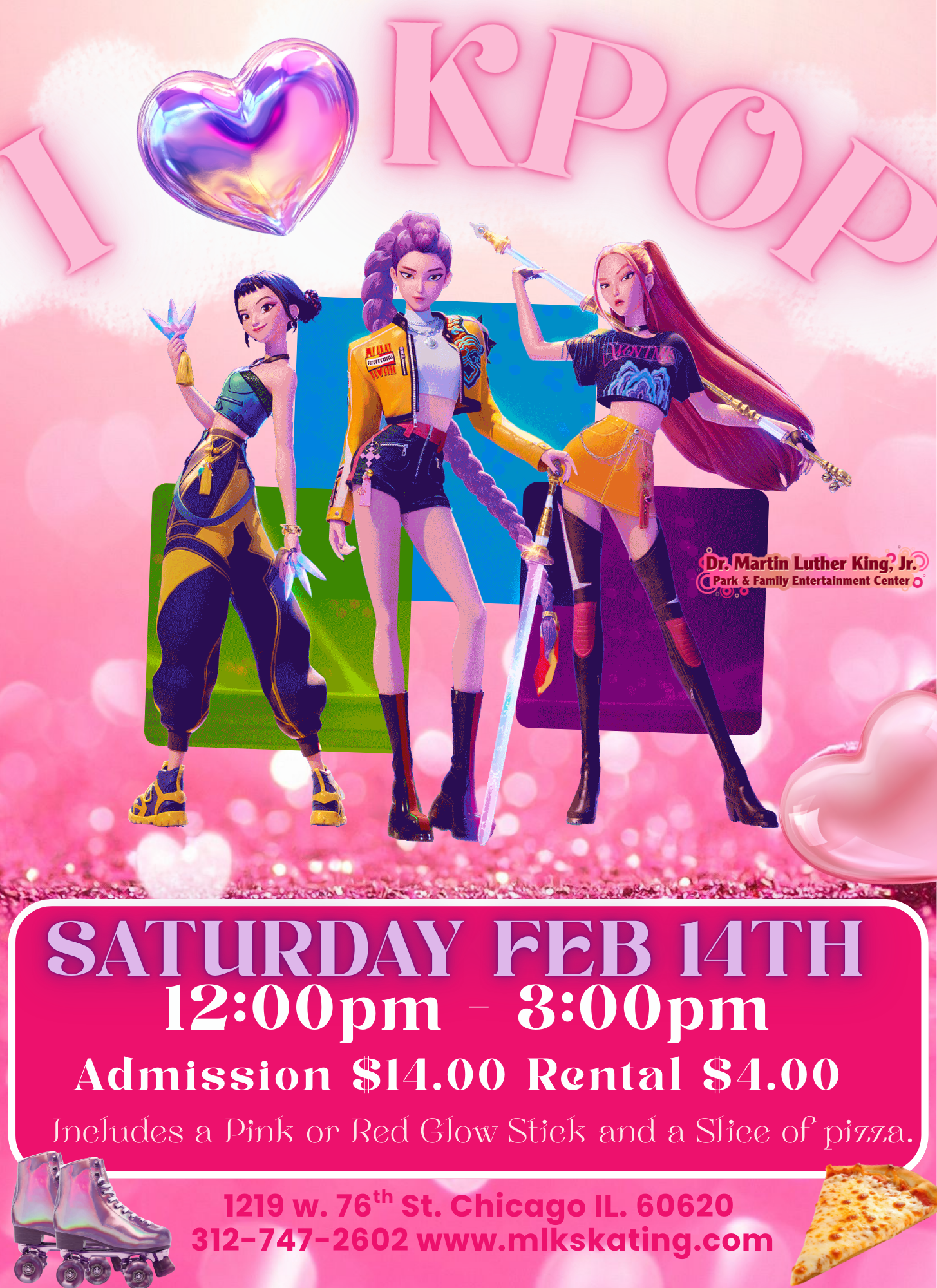 $14.00 ποΈ Admission INCLUDES:πβ€οΈ Pink OR Red Glow Stick π Slice of Pizza $4.00 Skate Rental OR