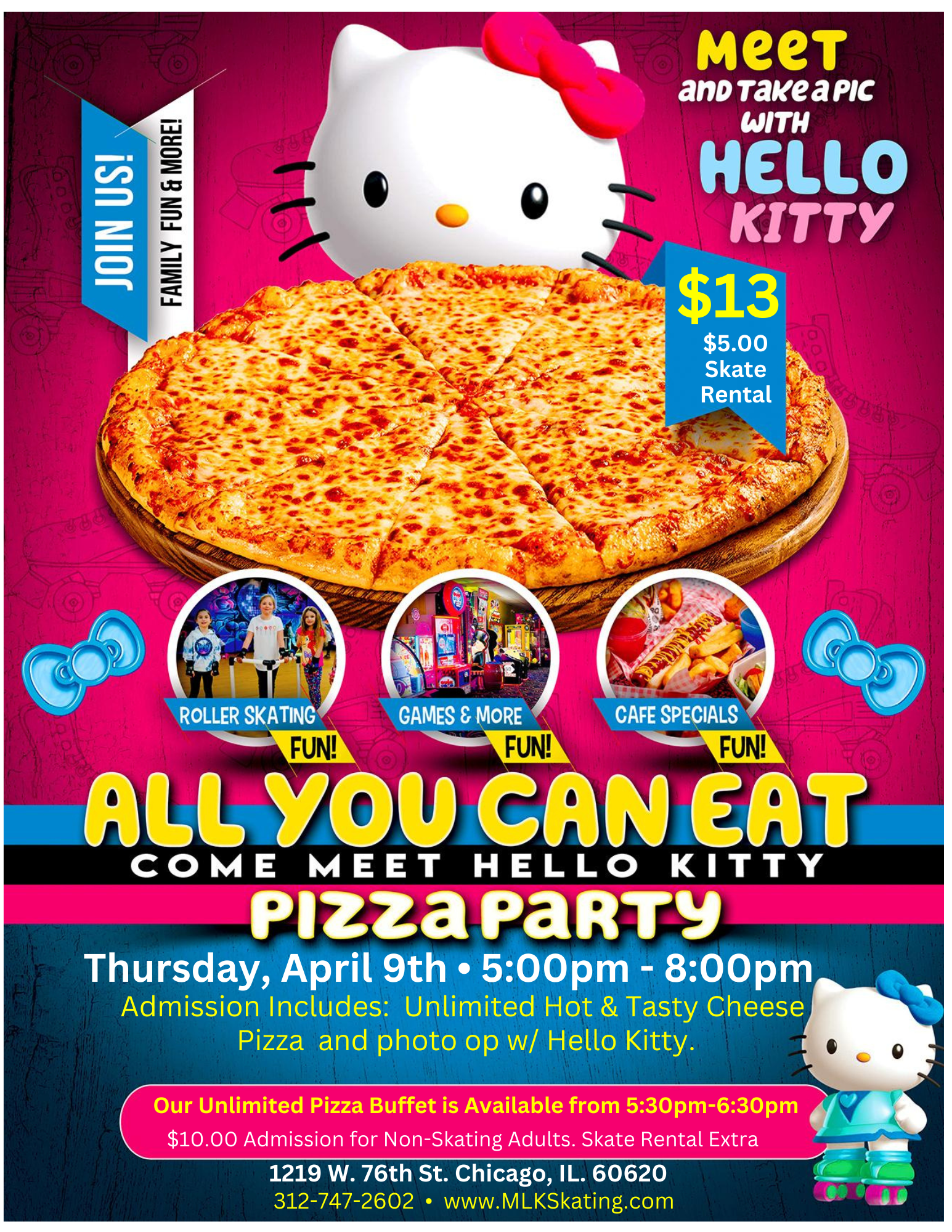 Join us for a purr-fectly fun night filled with skating, pizza, and a special visit from everyone's favorite kitty! ✨ Admission Includes:🍕 Unlimited Hot & Tasty Cheese Pizza (🕠 Unlimited […]