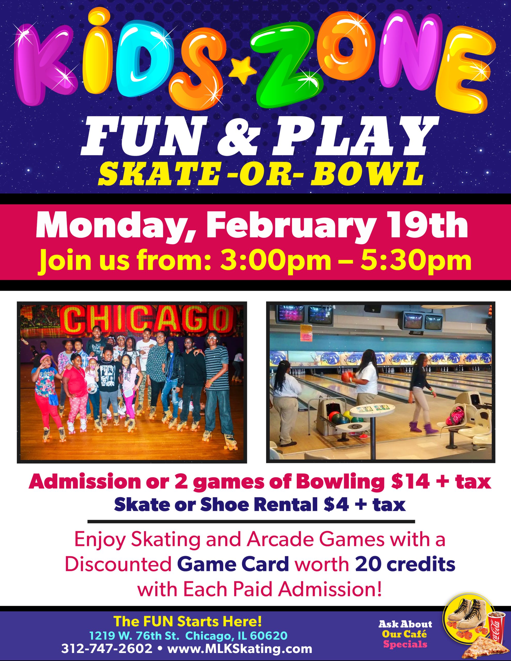 Bring your kids out and enjoy Skating and Arcade games with a discounted game card worth 20 credits with each paid admission. $14.00 Admission $4.00 Skate Rental or $14.00 2 Games of Bowling $4.00 Shoe Rental $14.00 Spectator Fee for Non-Skating OR Non-Bowling Adults Each Activity will need to be paid for separately.