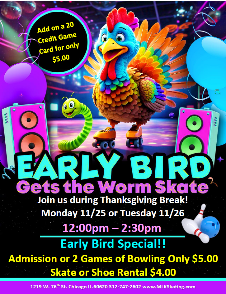 Join Us During Thanksgiving Break! We have many great events for everyone! Come see The Trolls, Mickey & Minnie, SpongeBob and More! We have Early Bird Skates, Glow Skates and More! Check Our Schedule for Times and Admission Prices. Make Plans to Come Out and Roll with Us!🛼🛼