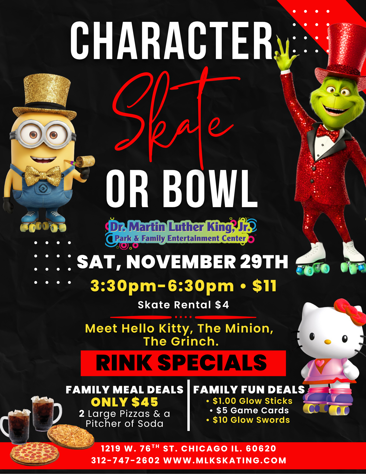 Dr. Martin Luther King, Jr. Park & Family Entertainment Center 1219 W. 76th St., Chicago, ILGet into the holiday spirit with The Grinch himself! 🥞✨Enjoy fresh waffles at our FUN Waffle Bar, snap pictures with the Grinch, and skate or bowl to holiday hits! 🎶🎅 ⭐ Waffle Bar is included for Skate or Bowling Admission tickets only! $13.00 Admission $4.00 Skate Rental OR $13.00 2 Games of Bowling $4.00 Shoe […]