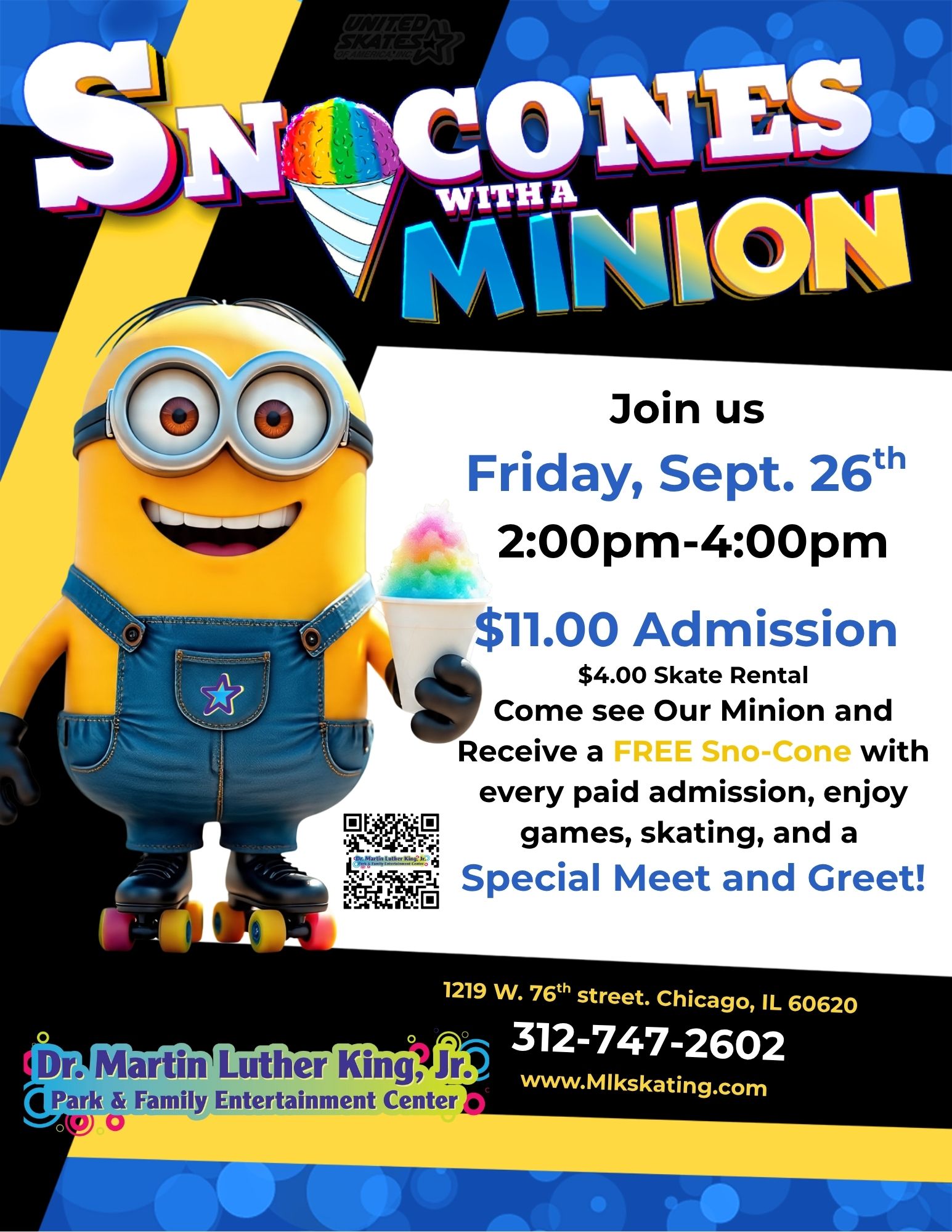 Dr. Martin Luther King, Jr. Park & Family Entertainment Center 1219 W. 76th St., Chicago, ILCelebrate the day off with our Minions Sno-Cone Skate on Friday, September 26th, 2025 from 2 PM – 4 PM! 🛼 $11 Admission + $4 Skate Rental🎳 Or choose 2 Bowling Games for $11 + Shoe Rental for $4🍧 FREE Sno-Cone with Every Paid Admission! Let the kids skate Or bowl and burn off energy […]