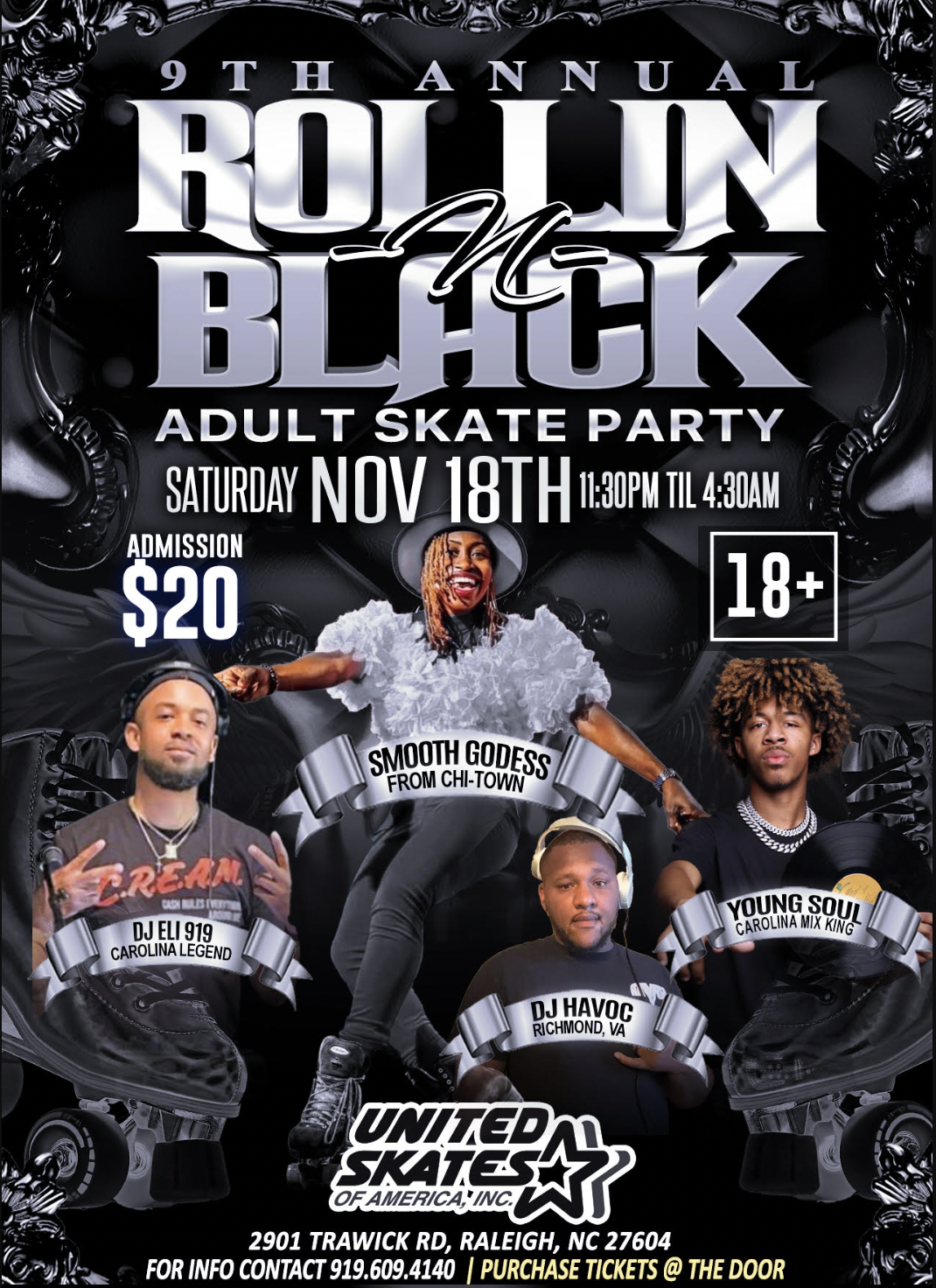 9th Annual Rollin N Black Adult Skate Party Adults Ages 18+ Only Featuring: DJ Eli 919 DJ Havoc and Young Soul $20 Admission $5 Skate Rental