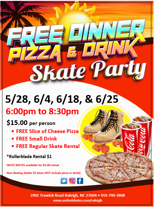 Free dinner night $15 Admission Includes regular skate rental, 1 slice of cheese pizza, and a small drink Rollerblade rentals $1