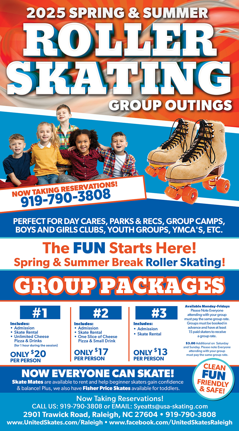 Starting at 15 skaters, get amazing group rates for camps, day cares, youth clubs, church groups, after school programs, parks and recreation programs, and more! Schedule a day out and get great discounted group rates and an all-inclusive experience. Group rates must be booked by a recognized organization, school, or church (Tax ID may be required). Group rates must be booked in advance.