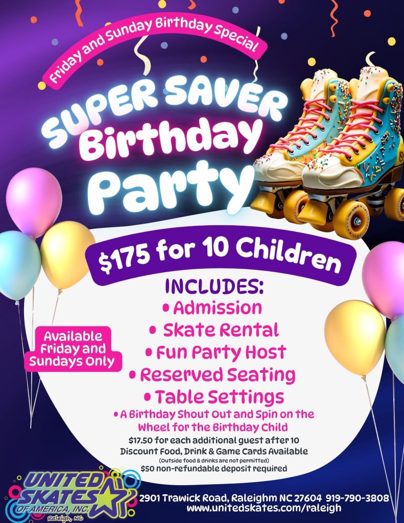 We have a fully stocked Roller Cafe full of family favorites, state-of-the-art sound systems, live DJs, and a huge arcade with awesome prizes. We are THE #1 place in Raleigh for kids’ birthday parties, STEM Field Trips, fundraisers for your schools and groups, exercise, and family fun for all! Our mission is to make dreams come true by providing the perfect environment for people of all ages, organizations, schools, clubs and groups to have incredible parties for all types of events!