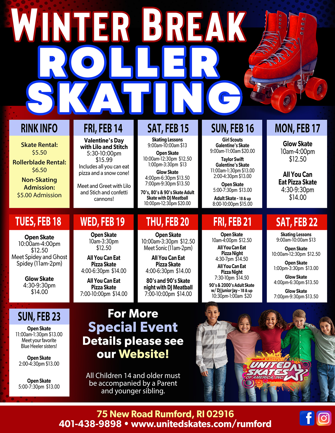 Looking for exciting activities this winter break? Come join us for roller skating at United Skates of Rumford! We have a week full of themed events, special deals, and non-stop fun for skaters of all ages.