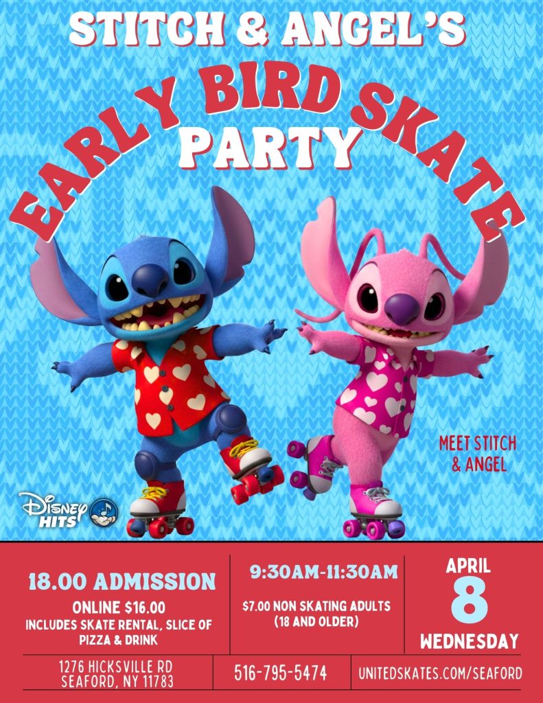 Meet Stitch & Angel, skate to your favorite Disney hits, and enjoy a fun-filled early session the whole family will love.