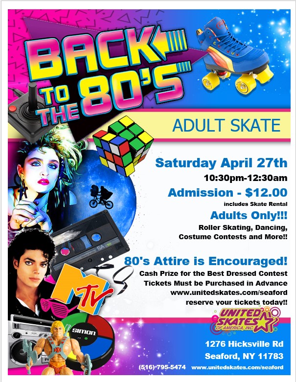 Welcome to the **Back to the 80’s – Adult Skate** event at United Skates of America Roller Skating Center! Get ready to groove to your favorite 80’s hits and show off your best moves on wheels. $12 includes admission and skate rental. Ages 18+