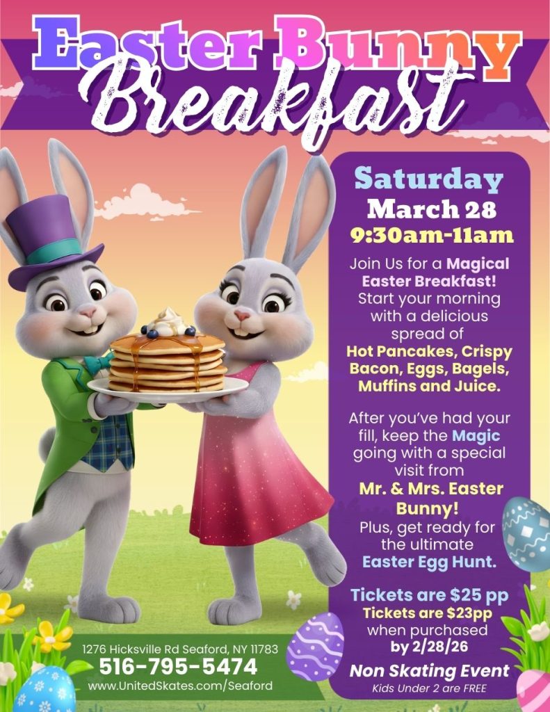 Join us for a delicious breakfast feast, a special visit from Mr. & Mrs. Easter Bunny, and an exciting Easter Egg Hunt right here at United Skates of America – Seaford!