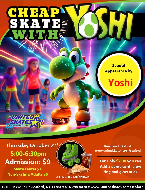 🎉 Cheap Skate with Yoshi 📅 Date: Thursday, October 2, 2025 🕔 Time: 5:00 PM – 6:30 PM 📍 Location: United Skates of America – Seaford 🎟️ Admission: