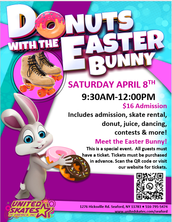 Includes Admission, Skate rental, A donut, Juice, photo Ops and Dancing