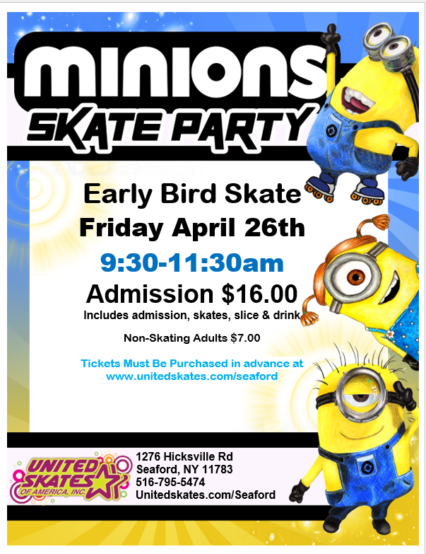 Welcome to the Early Bird Skate with the Minions event! Join us at the United Skates of America Roller Skating Center for a fun-filled morning of skating with your favorite yellow friends. Get ready to groove to some awesome tunes and show off your best moves on the rink. Don’t miss out on this chance to hang out with the Minions and make unforgettable memories. Lace up your skates and come skate with us! Admission includes a slice of pizza and small drink.