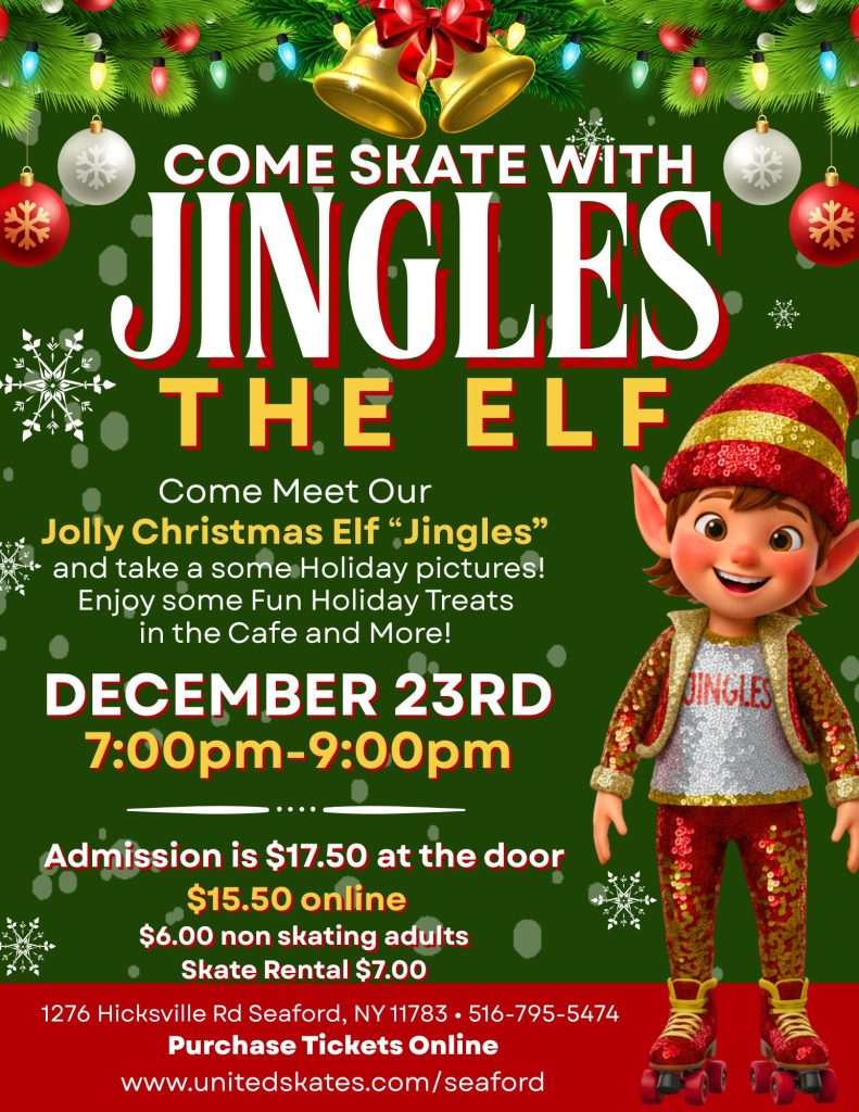 Get ready to jingle and roll at our Elf Skate Party on Monday, December 23rd from 7:00pm to 9:00pm at United Skates of America β Seaford!