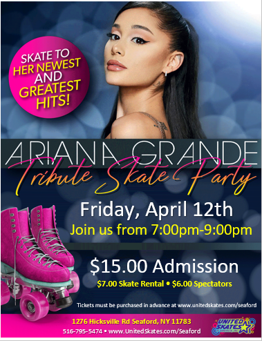 Welcome to the Ariana Grande Skate Party! Get ready to lace up your skates and groove to the music of everyone’s favorite pop diva. Join us at United Skates of America Roller Skating Center for a night of fun, friends, and fantastic tunes.