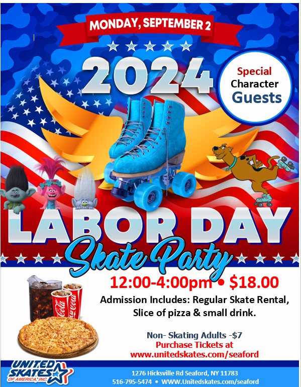 Come join us at United Skates of America Roller Skating Center for a fun-filled Labor Day Character Skate event! Skate around with your favorite characters and enjoy a day of laughter and excitement. This in-person event is perfect for families and friends looking to have a blast on Labor Day. Don’t miss out on this opportunity to create lasting memories!