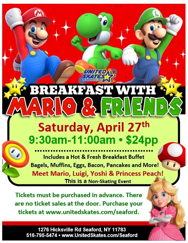 Welcome to the Mario & Friends Breakfast event! Join us at the United Skates of America Roller Skating Center for a morning filled with fun and delicious food. Meet your favorite characters from the Mario while enjoying a tasty breakfast spread. This in-person event is perfect for fans of all ages to come together and celebrate the iconic video game series. Don’t miss out on this unique opportunity to start your day with Mario and his friends! This is a non-skating event