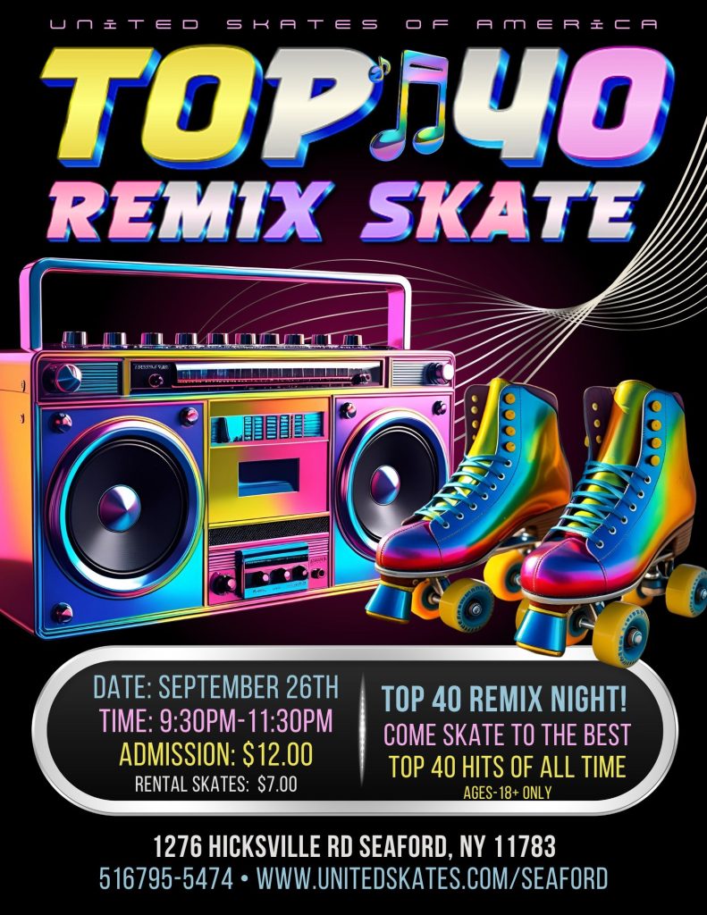 🎶 Sounds like a night to roll into the rhythm! Here’s the scoop on the Top 40 Remix Party at United Skates of America in Seaford, NY: