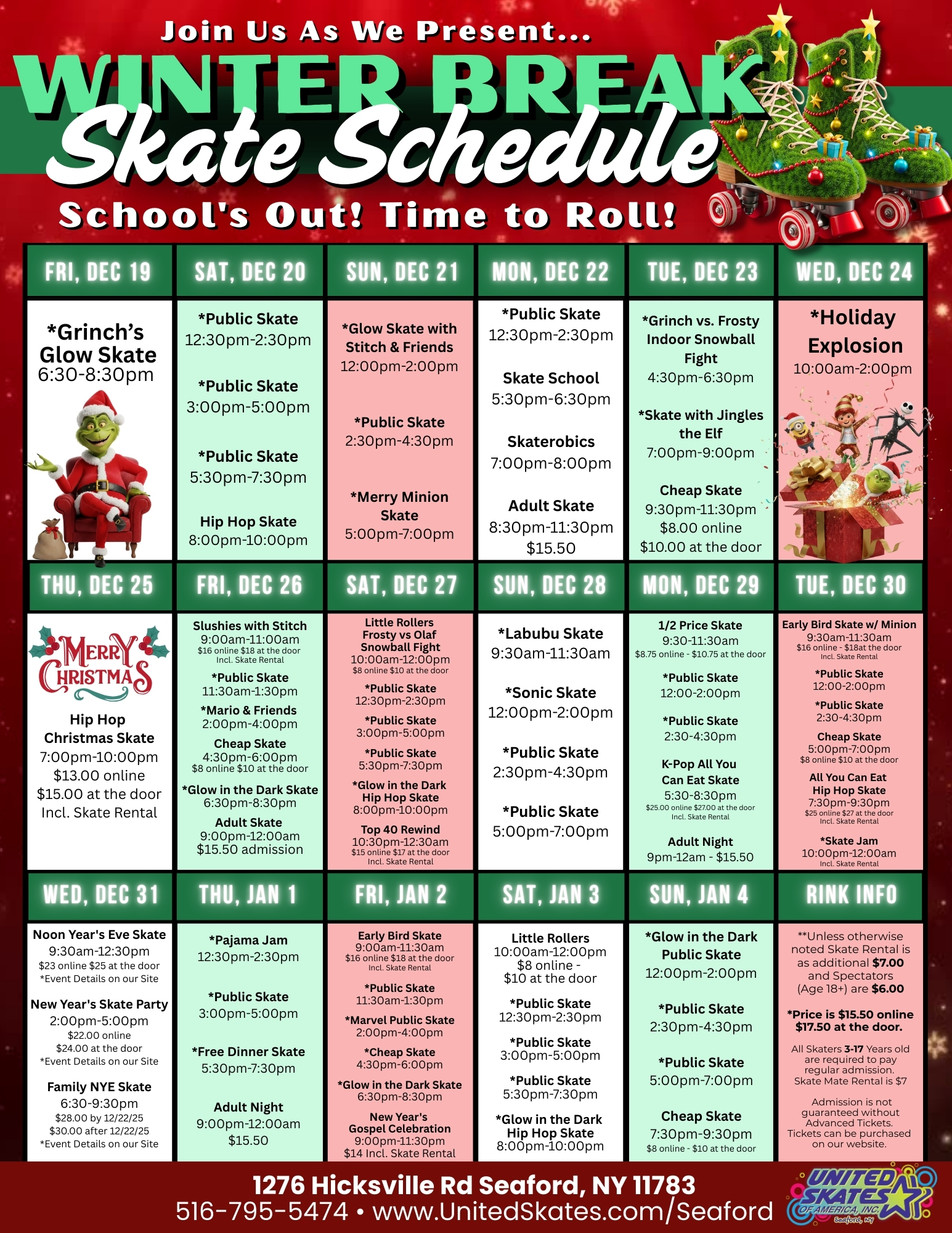 Dec 19 December 19, 2025 @ 6:30 pm - January 4, 2026 @ 9:30 pm Winter Break Skate Schedule — School’s Out, Time to Roll!
