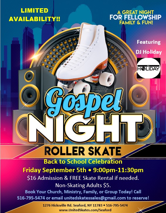 Gospel Night Friday, September 5 | 9:00–11:30 PM $16 Admission includes FREE Skate Rental Non-Skating Adults: $5 Celebrate with DJ Holiday and a night of uplifting gospel beats. Perfect for […]