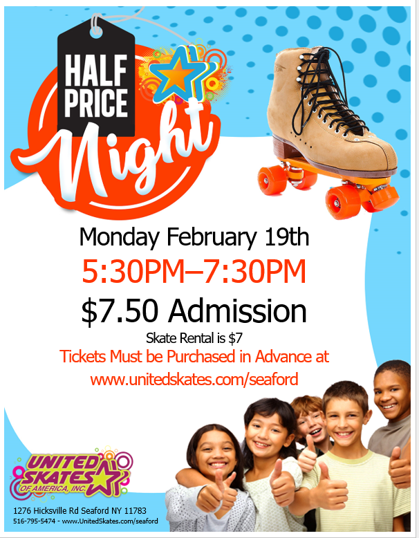 Half Price Skate Night $7.50 admission for Skaters & Non Skaters Skate Rental is $7 Tickets Must be Purchased in Advance Click Here For Tickets Click Here for Waiver