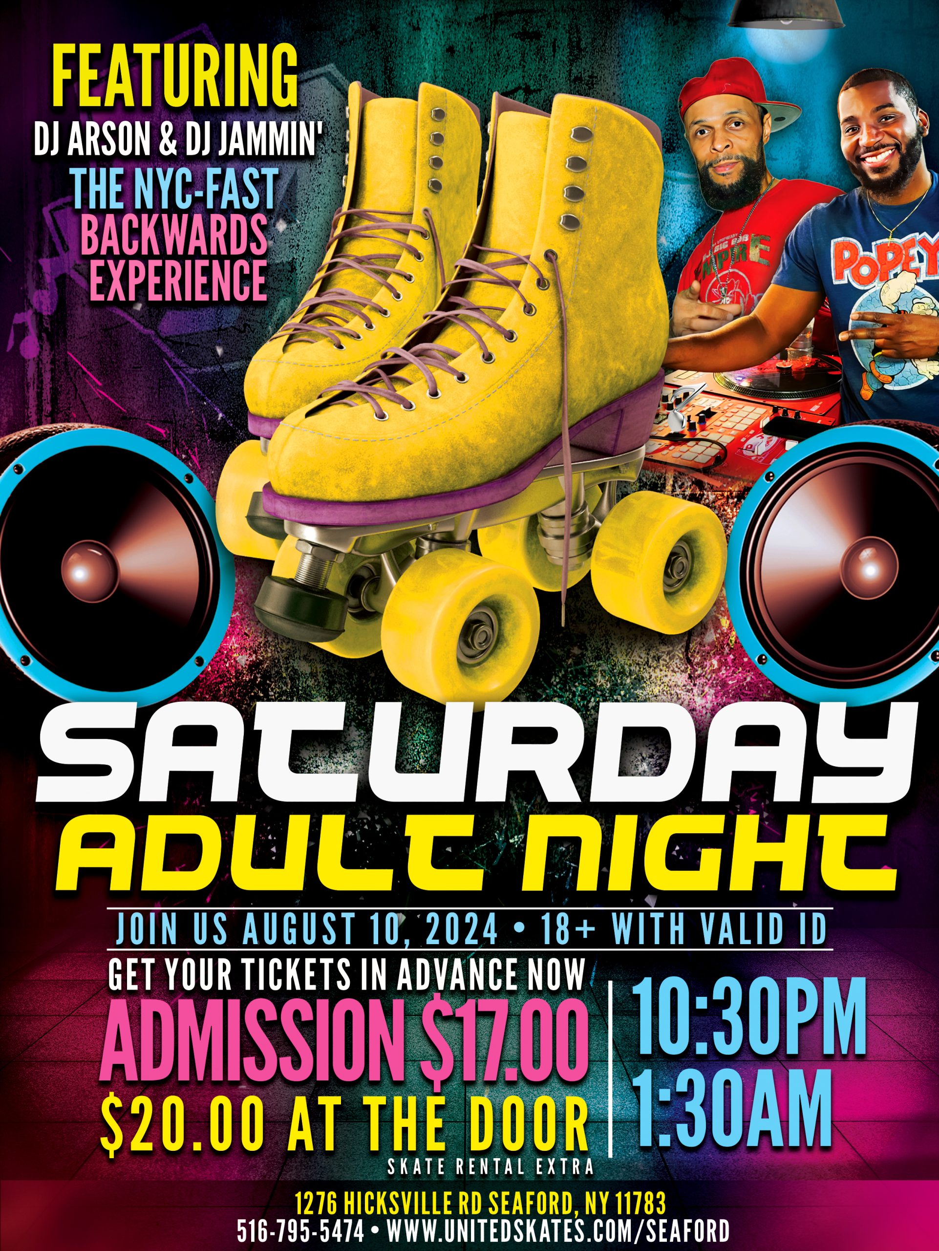 Exciting Announcement! Every 2nd Saturday United Skates will be hosting Adult Night from 10:30pm-1:30pm! This month we are featuring DJ Arson & DJ Jammin' ! Tickets purchased in advance $17 at the door $20 Click Here for Tickets