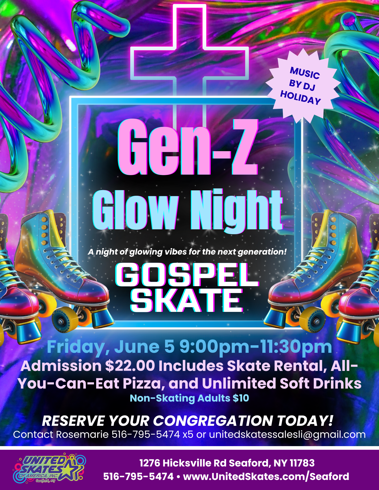 A night of glowing vibes for the next generation! 🗓️ Friday, June 5, 9:00 PM – 11:30 PM 🎧 Featuring uplifting Gospel music by DJ Holiday 🍕 Your ticket includes: Admission, Skate […]