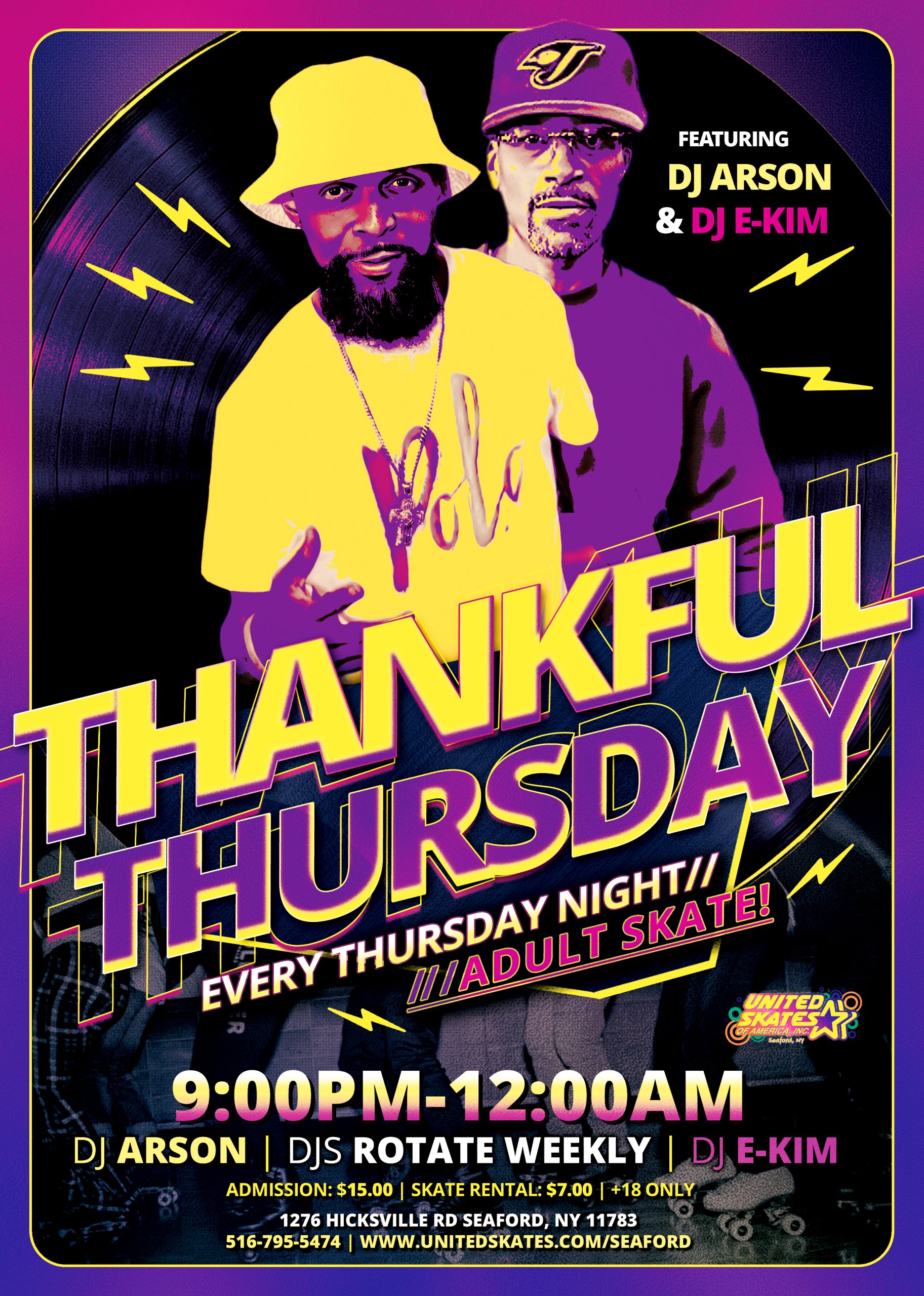 Adult Night Skate Must be over the age of 18 Admission is $15 Skate Rental is $7 DJ Arson & DJ E-Kim rotate weekly Please Fill out your waiver prior to arrival Click Here for Waiver