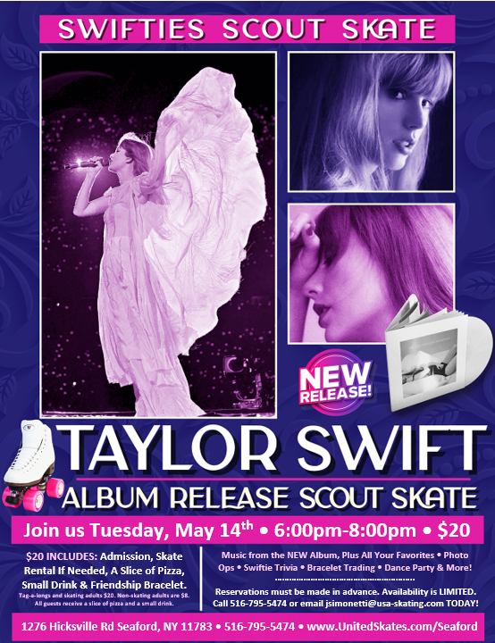 Calling all Scouts! You've skated through the Eras, now let's skate to Taylor's Brand New Album, The Tortured Poets Department! Join us, Tuesday, May 14th from 6pm-8pm. Music from the new album, PLUS all your favorites! Availability for this BRAND NEW Swiftie Experience is LIMITED! Reserve your Troop TODAY!!$20 for all Scouts, Tag-a-longs and Skating […]