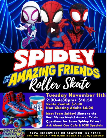 United Skates Of America Seaford 1276 Hicksville Rd., Seaford, NY🕷️🛼 Spidey’s swinging into the rink! Join us for the Spiderman Skate Party on Tuesday, November 11th from 2:30PM–4:30PM at United Skates of America Roller Skating Massapequa! 🎉 It’s a web-slinging good time for the whole family: • 🕸️ Meet & skate with Spiderman himself! • 🎶 Jam to fun music while you roll • […]