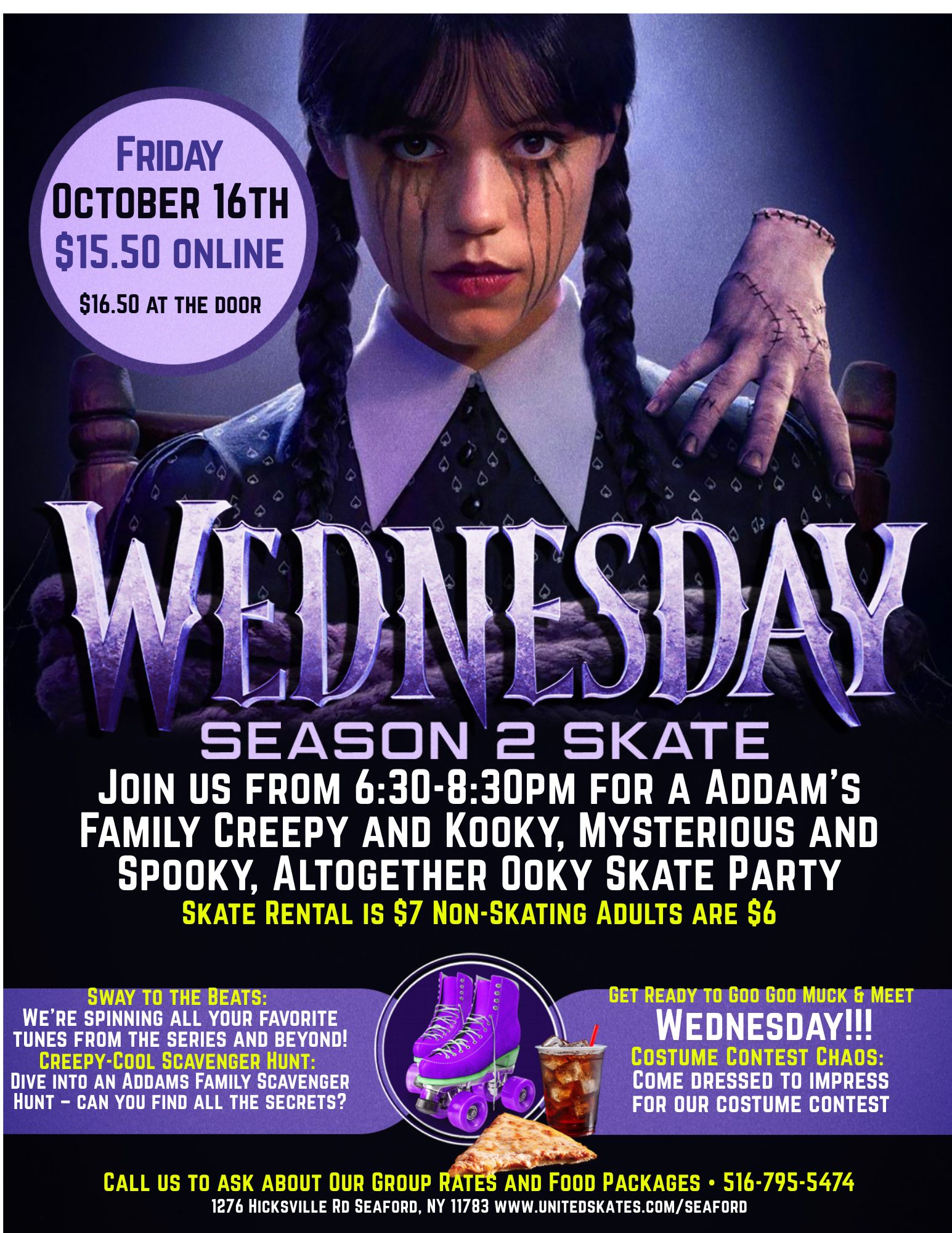 United Skates🎩 Wednesday Addams’ Sinister Sunday Skate Bash 📅 Date: Friday October 17th 🕛 Time: 6:30pm-8:30pm 📍 Location: Massapequa, NY Join us for a midday dose of mischief and mayhem as Wednesday Addams rolls into town for a hauntingly hilarious skate session! 🕷️ Ghastly Details: $16.50 Admission — pay the price to enter the shadows $15.50 […]