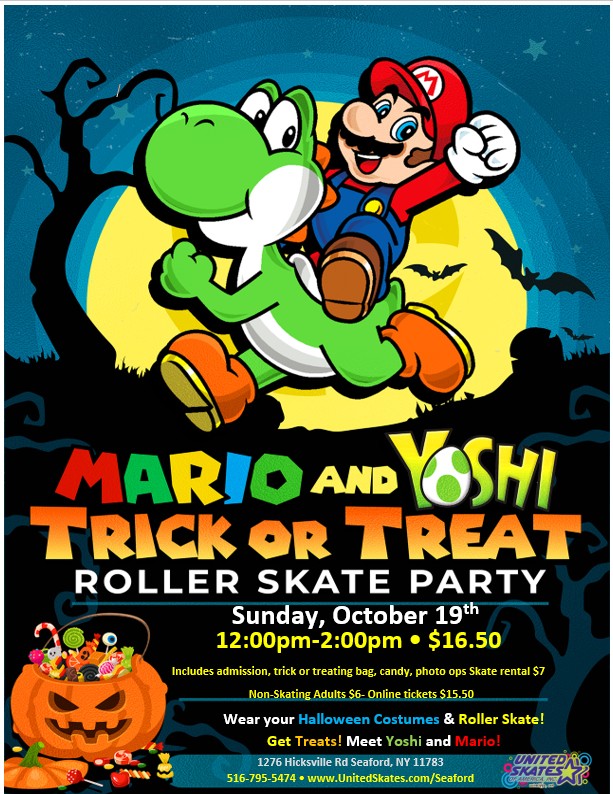 United Skates Of America Seaford 1276 Hicksville Rd., Seaford, NY🍄🛼 Let’s-a Go… Skating! 🛼🍄 Join us for a power-up packed afternoon at the Mario & Yoshi Trick-or-Treat Skate Party! 🎃✨ 🗓 Sunday, October 19th 🕛 12:00 PM – 2:00 PM 📍 United Skates of America 🎟️ $16.50 Admission | $15.50 Online 🛼 $7 Skate Rental 👀 $6 for Non-Skating Adults 🎮 Meet Mario & Yoshi in person! 🍬 Go trick-or-treating around the rink! 🧡 Costumes encouraged for […]