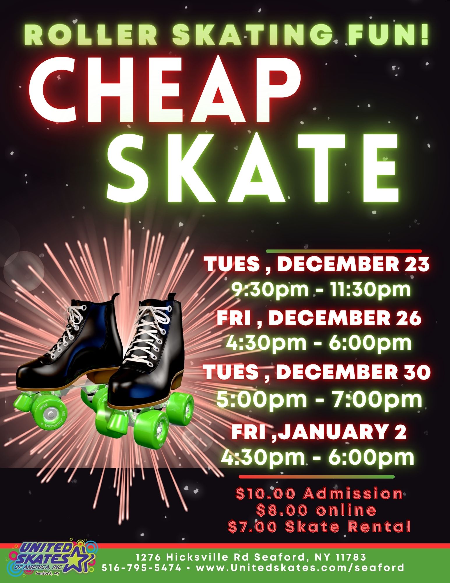 Cheap Skate Admission is $10 at the door/ $8.00 online Skate Rental is $7 Non Skating Adults are $6 Click Here for Tickets