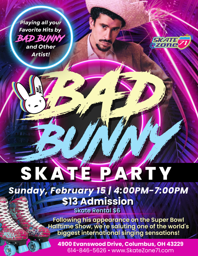 Lace up and roll to the hottest Latin vibes on wheels! We’re turning the rink into a powered playground with Bad Bunny all session! Neon lights, booming bass, and nonstop energy straight from Puerto Rico to the rink floor!!
