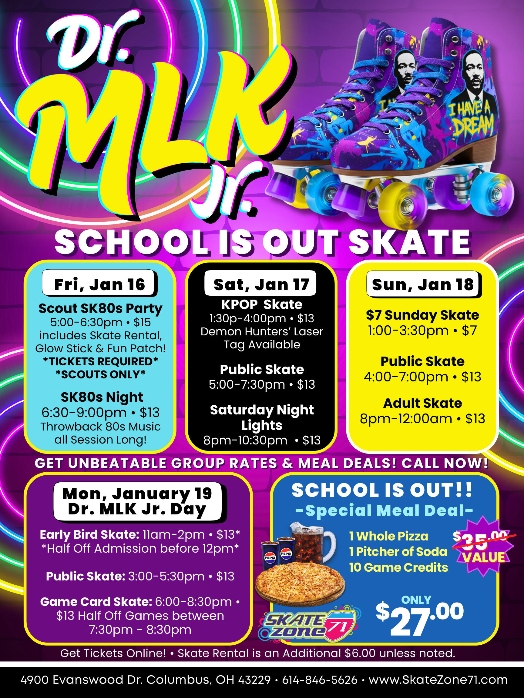 School’s out — time to roll into winter fun! Bring your friends and family to our Dr. MLK Jr. Weekend Skating Sessions for cool tunes, hot games, and nonstop fun on wheels!