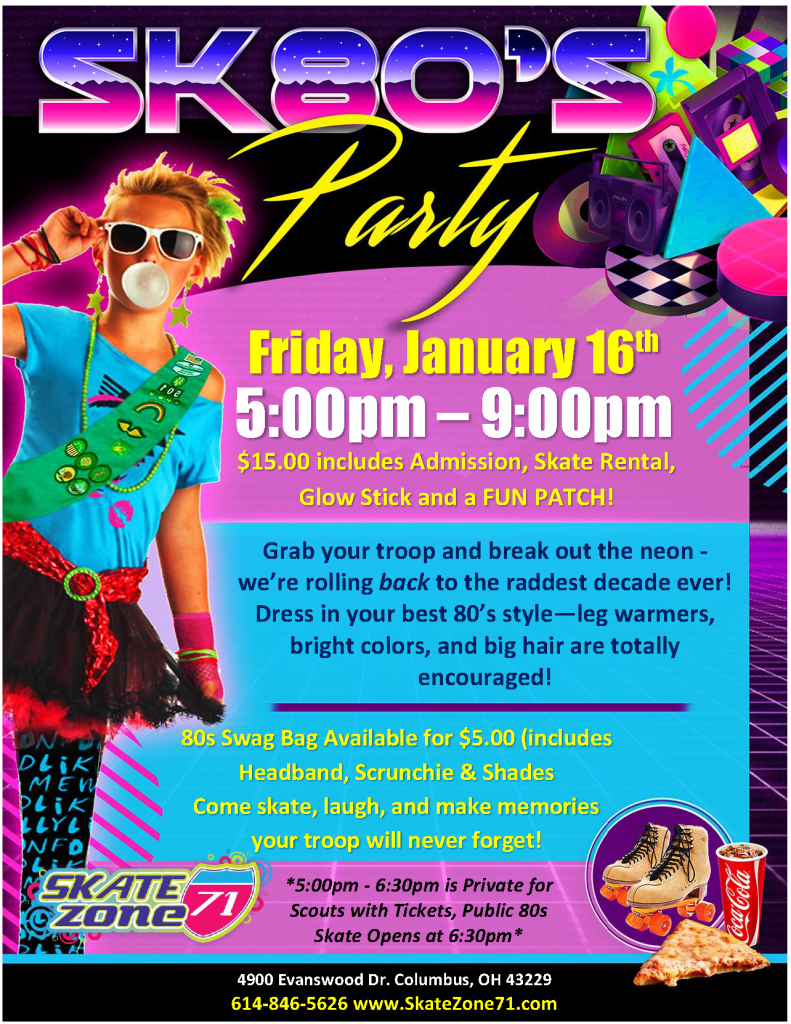 Come skate, laugh, and make memories your troop will never forget! The first hour & half is exclusive for Girl Scouts with ticket reservations. All attendees will enjoy Free Stayover into the 80’s Public Skating Event beginning at 6:30pm!