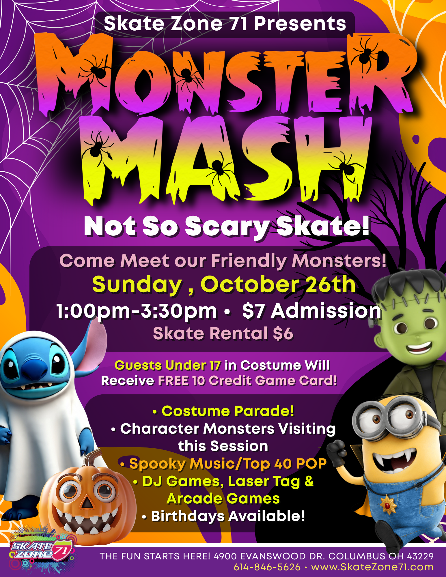 Come meet our friendly monsters! We’ve got a not-so-scary skate this Sunday before Halloween. Guests under 17 that wear costumes will receive a 10 Credit Game Card for our arcade!