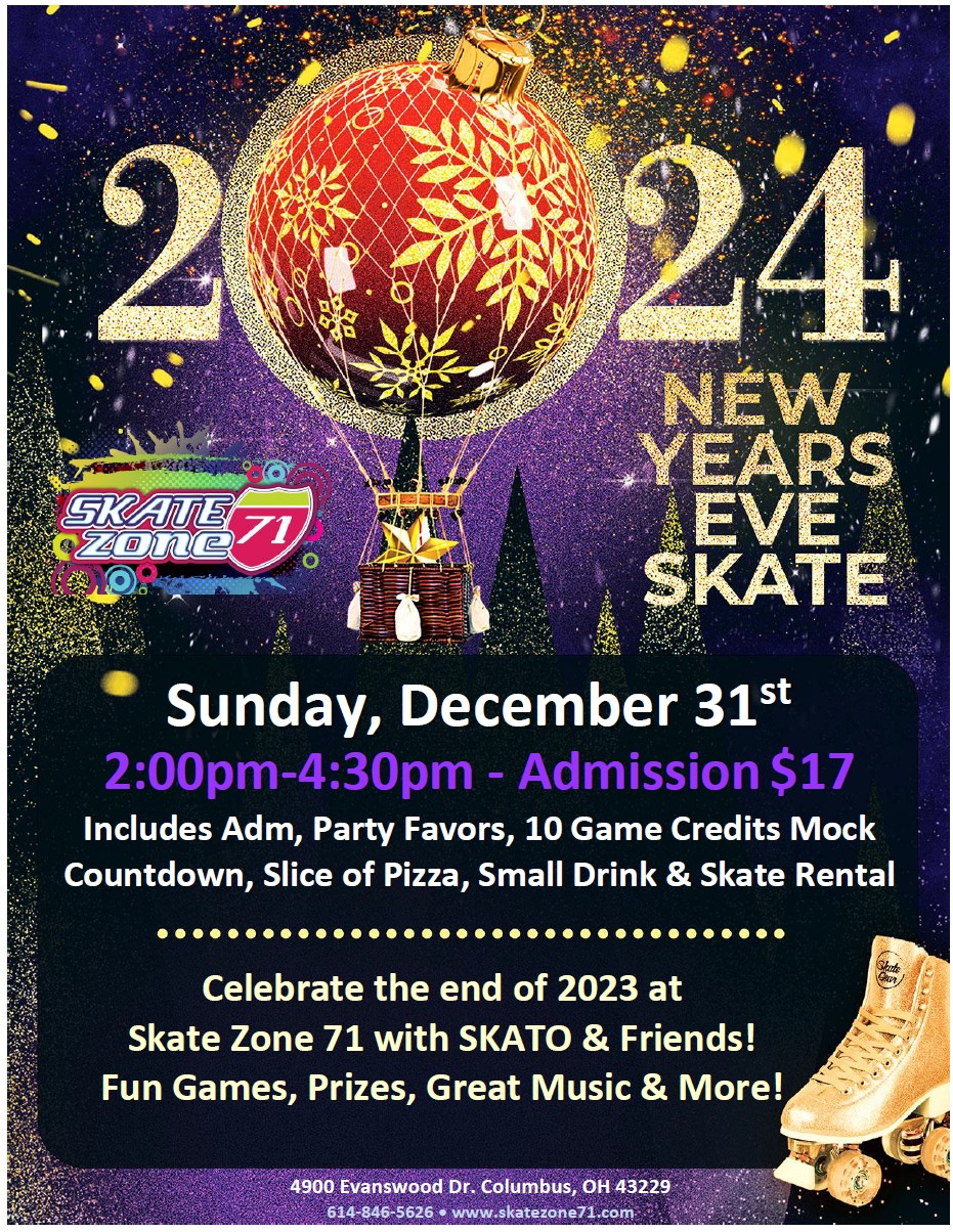 $17 Admission – includes Skate Rental, Slice of Cheese Pizza & Drink, 10 Game Credits with Noise Makers and an Early Mock Countdown to 2024!