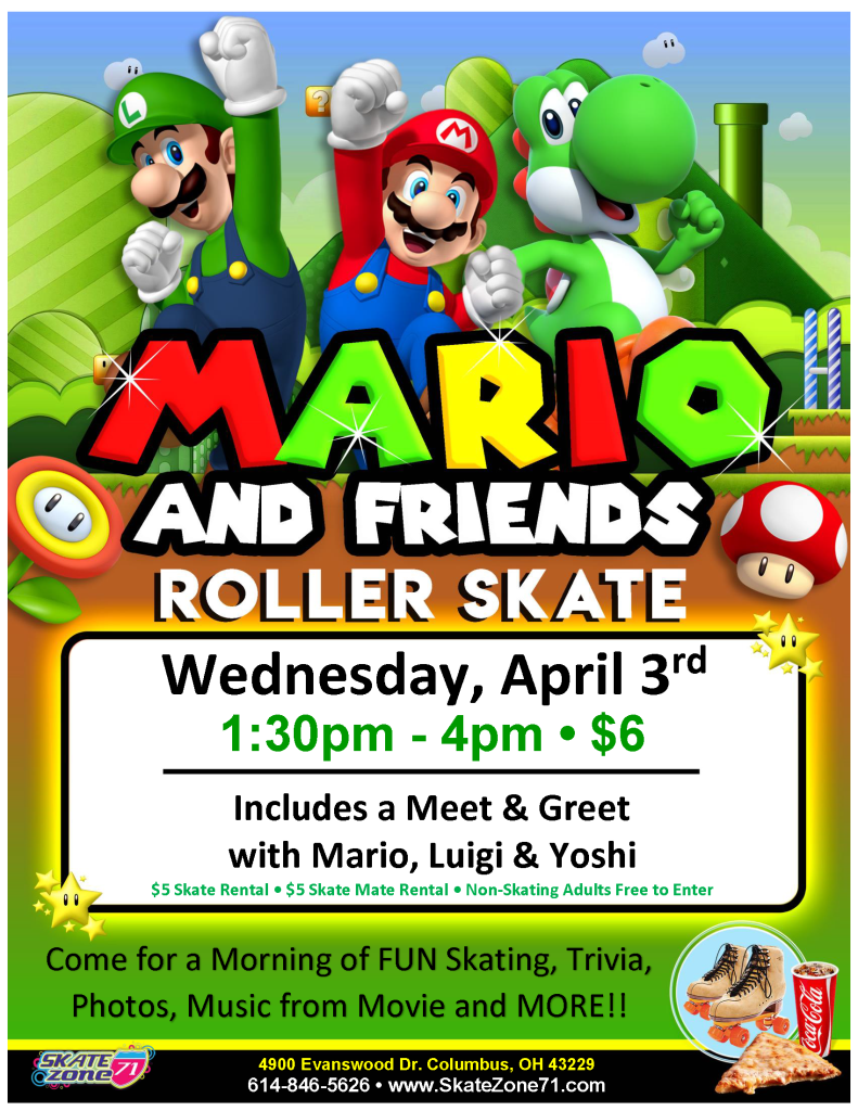 Join us for a FUN Skating Session full of special visits from Mario, Luigi & Yoshi!!